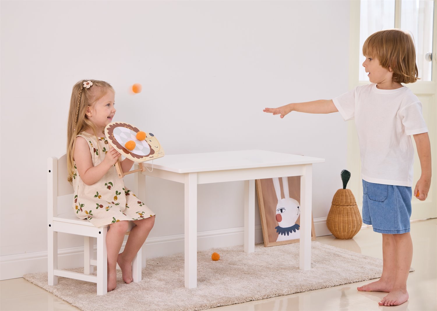 De tafelversie van dit klassieke werpspel is compact en eenvoudig op te zetten, perfect voor binnen, maar ook leuk om buiten te spelen. De zachte balletjes zijn veilig voor kleine handjes en stimuleren behendigheid, concentratie en competitie op een speelse manier.