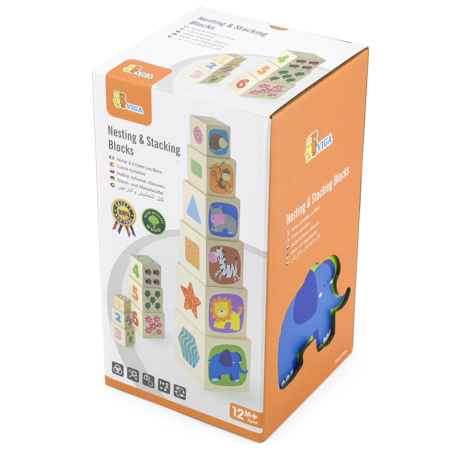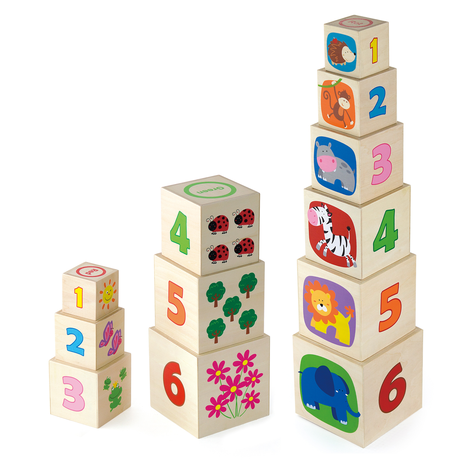 Vrolijke houten blokken, zes stuks, om te stapelen, sorteren of te nestelen. Op iedere zijde een ander thema; safaridieren, tuin, vormen, kleuren en getallen. Goed ter bevordering van de motoriek en oog-hand coördinatie.