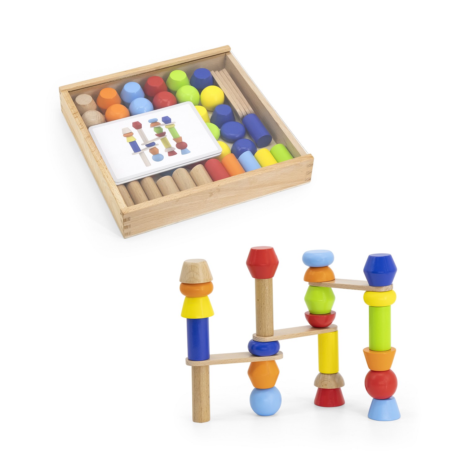 Het houten speelgoed spel bevordert concentratie, evenwicht, logisch denken en fijne motoriek, terwijl kinderen spelenderwijs leren over vormen, kleuren en verhoudingen. Geleverd in een stevige houten opbergdoos met 6 dubbelzijdige voorbeeldkaarten.