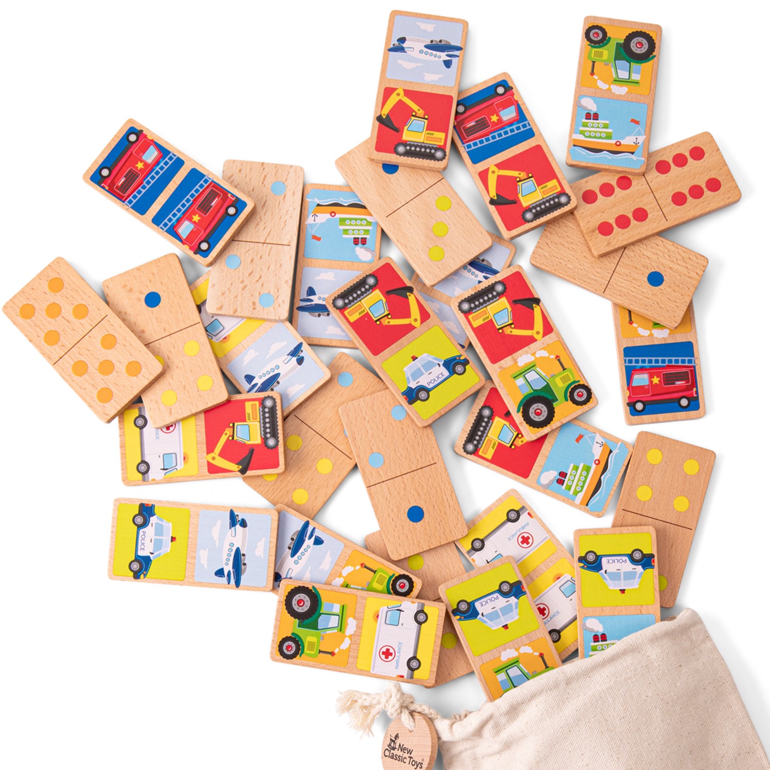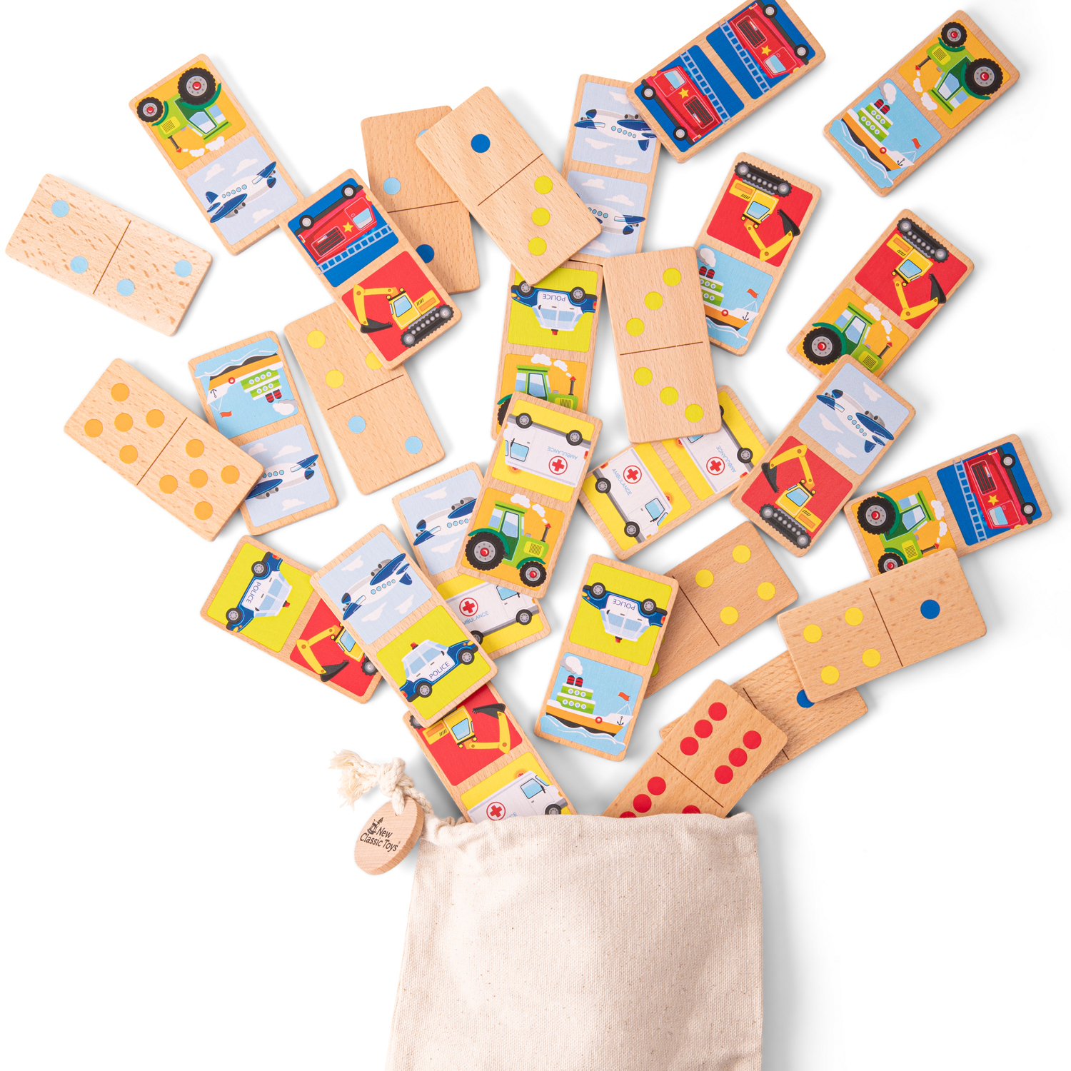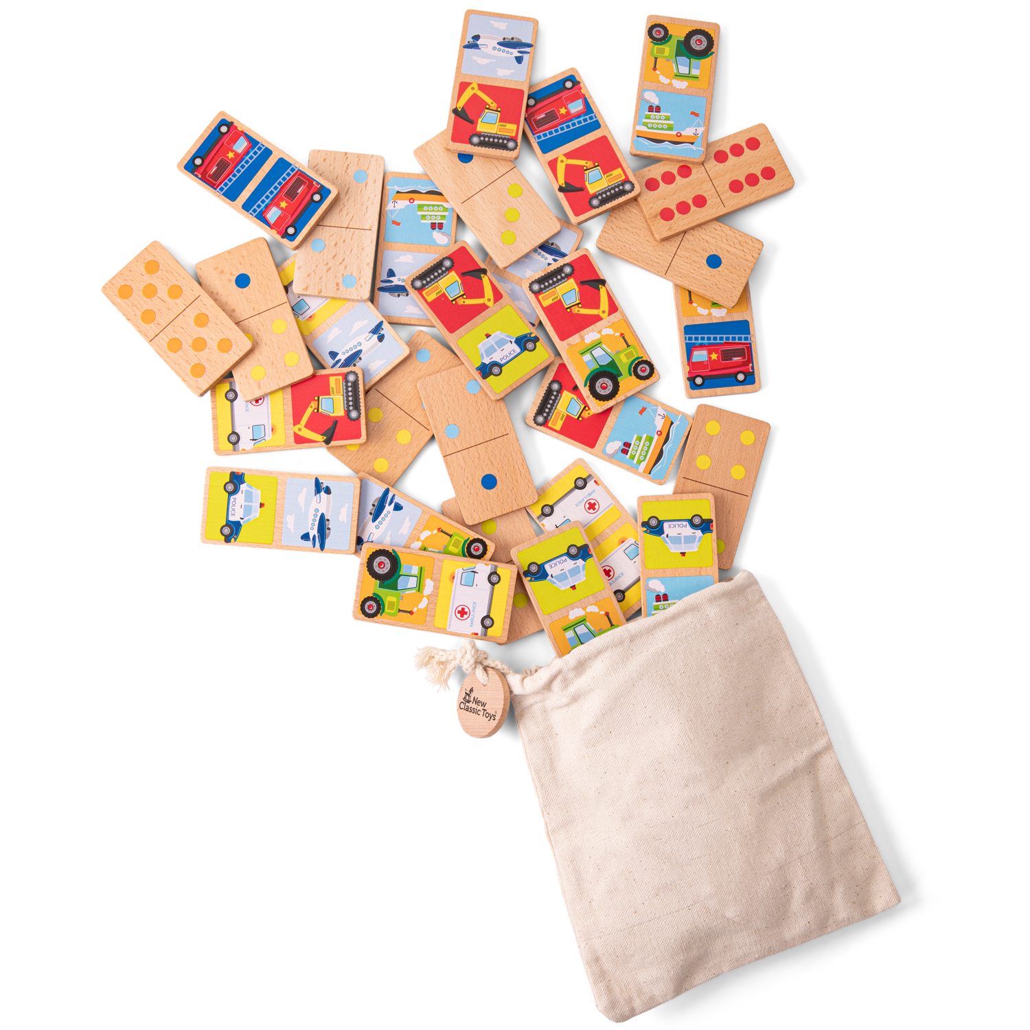 Het spel bevat 28 dubbelzijdige dominostenen, elk voorzien van illustraties van verschillende voertuigen zoals ambulance, tractor en brandweerauto. Aan de andere kant zijn de stenen bedrukt met klassieke stippen voor de meer traditionele spelvariant. Dit spel is niet alleen leuk om te spelen, maar helpt kinderen ook bij het ontwikkelen van hun observatievermogen, herkenning van patronen en het leren van sociale vaardigheden zoals wachten op je beurt. De dominostenen worden geleverd in een handige stoffen opbergzak, wat het spel gemakkelijk mee te nemen en op te bergen maakt. Dit dominospel is gemaakt van FSC® 100% -gecertificeerd hout.