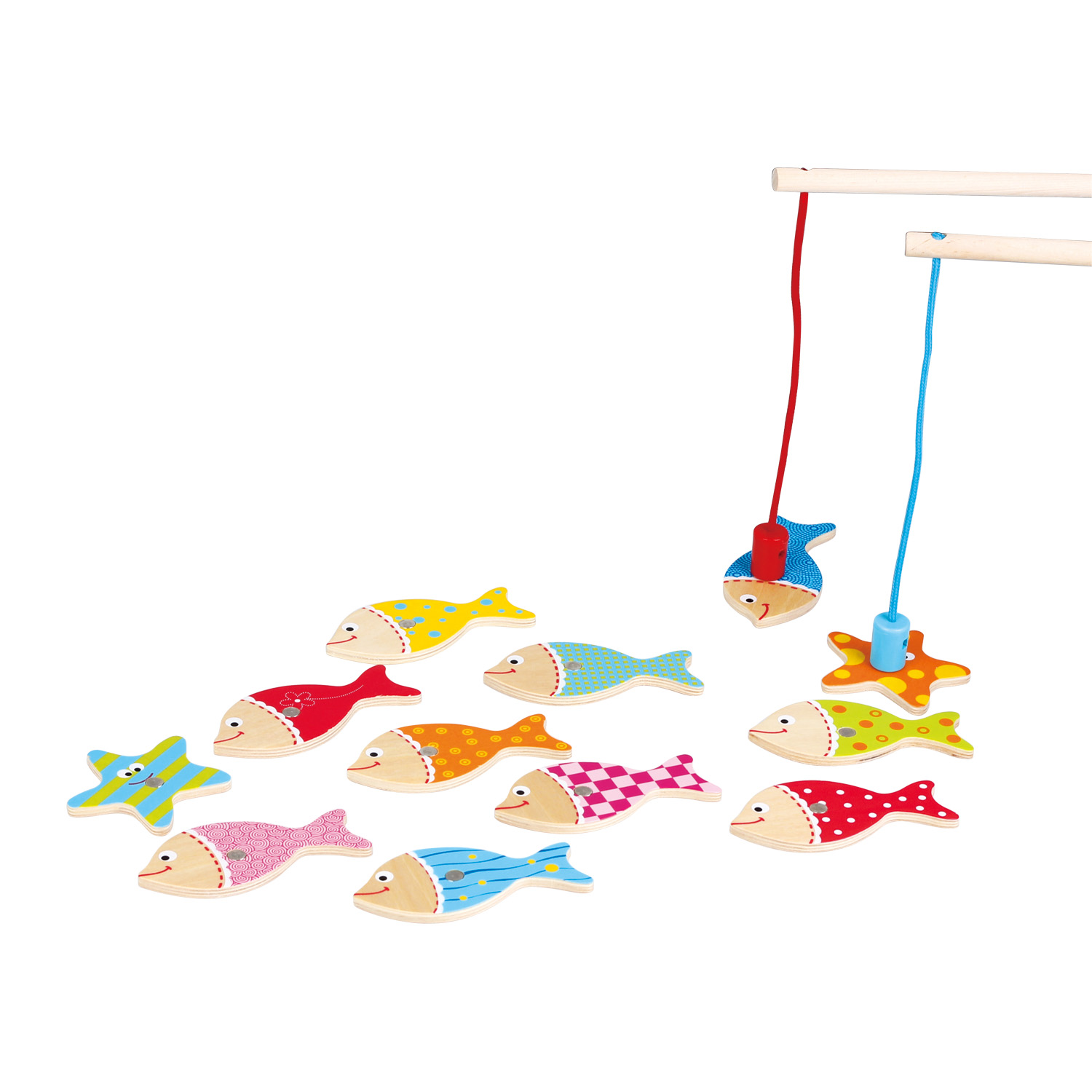 Inhoud: 12 houten zeedieren, 2 magnetische hengels