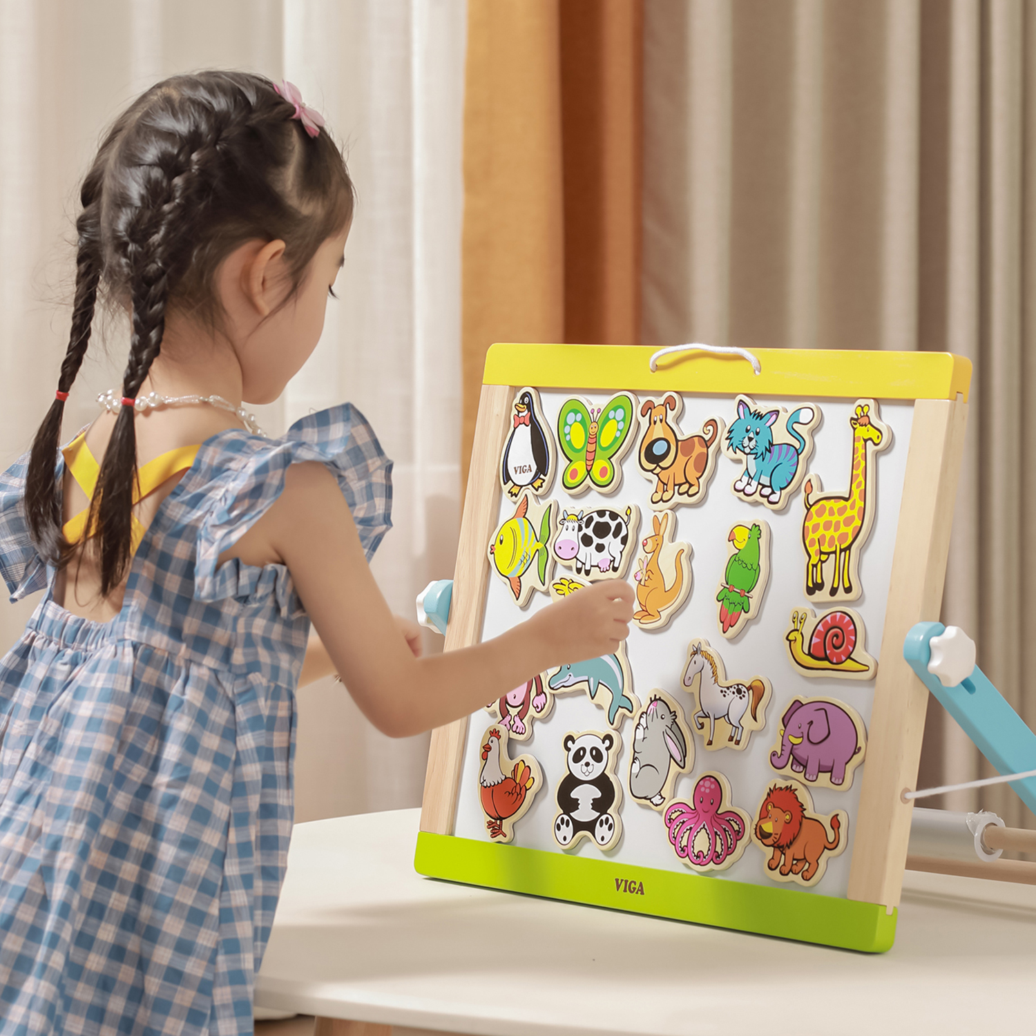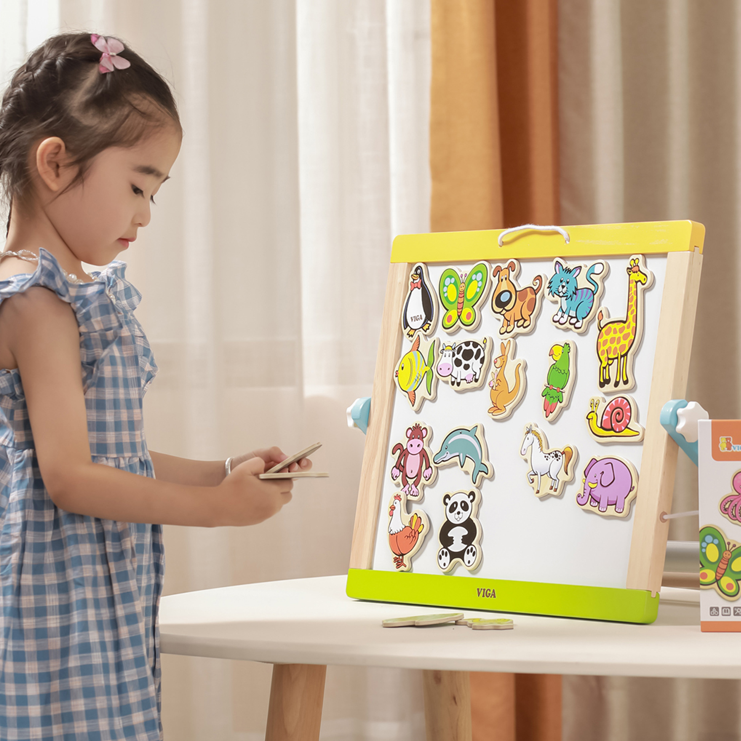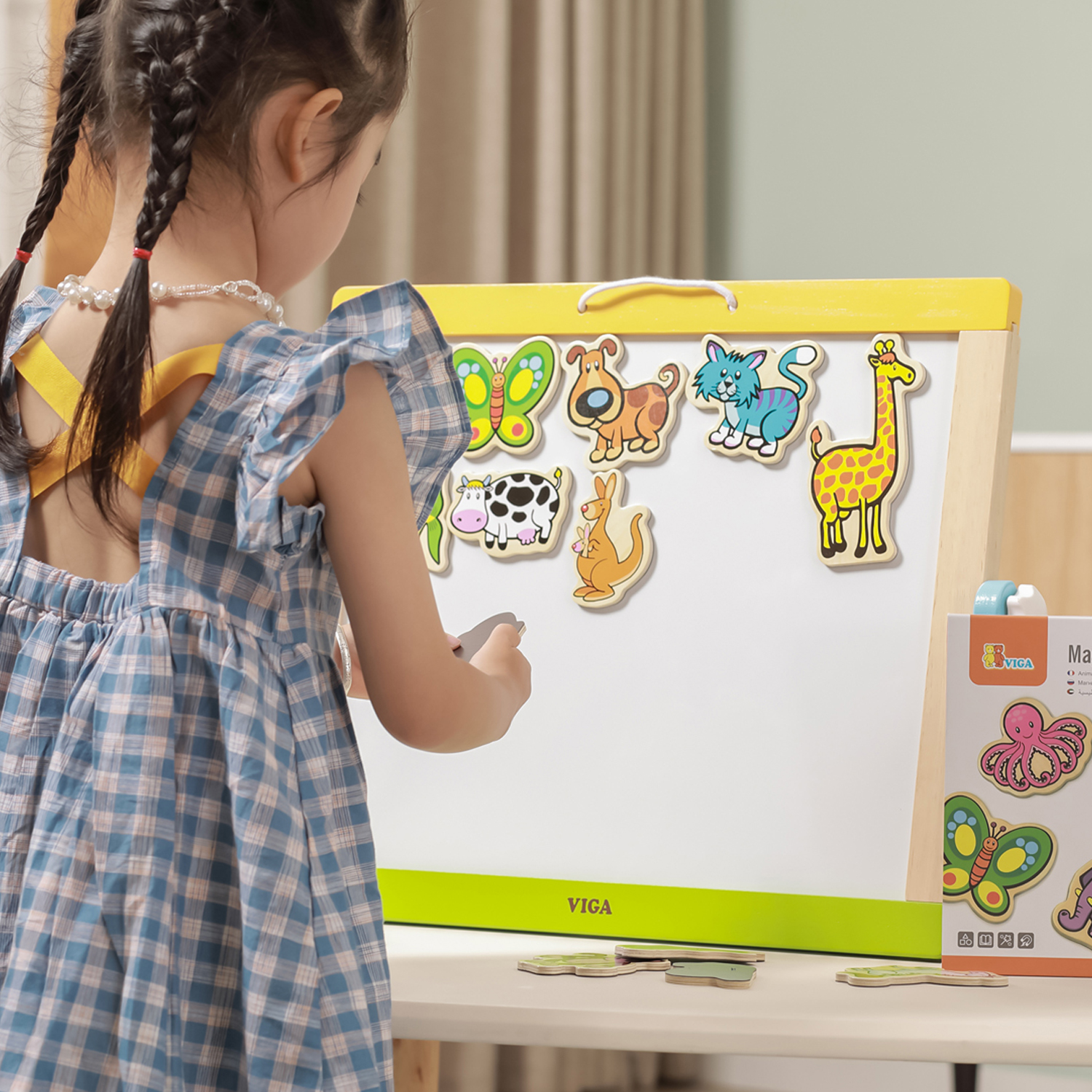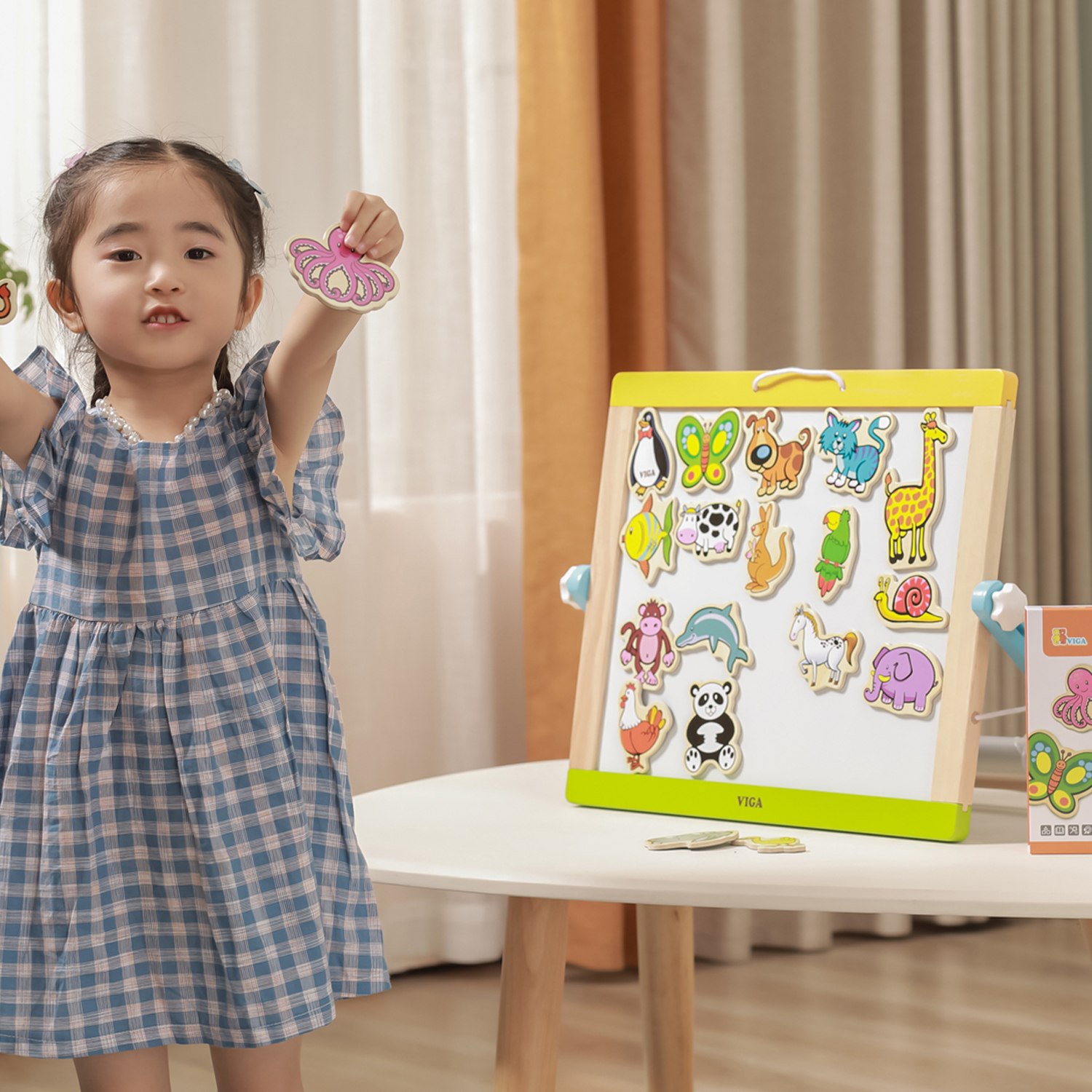 Twintig magnetische dieren in een doos. Deze vrolijke houten kindermagneten van Viga Toys hebben allemaal verschillende afbeeldingen van dieren. Leuk en leerzaam om mee te spelen.