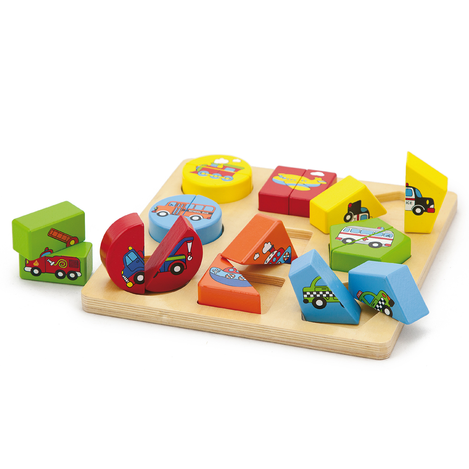 Prachtige puzzel met verhoogde mooi afgewerkte geometrische vormen in heldere kleuren. Maakt dat kleine handjes gemakkelijk de achttien stukjes eruit pakken en weer terug kunnen plaatsen in de negen vormen van de puzzel. Stimuleert het herkennen van vormen, kleuren en de fijne motoriek.