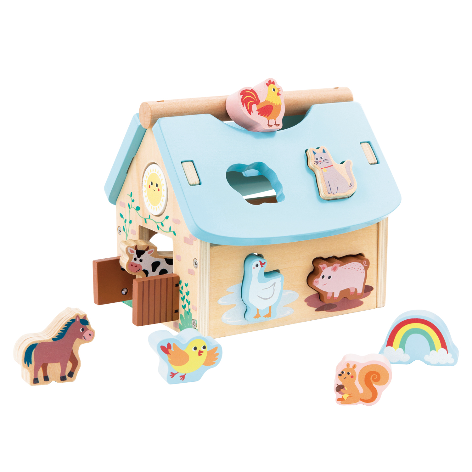 Tijdens het spelen met dit houten speelgoed oefenen ze hun fijne motoriek, kleur- en vormherkenning en leren ze problemen oplossen op een speelse manier. Dankzij het handvat op het dak is de sorteerboerderij makkelijk op te tillen en overal mee naartoe te nemen.
