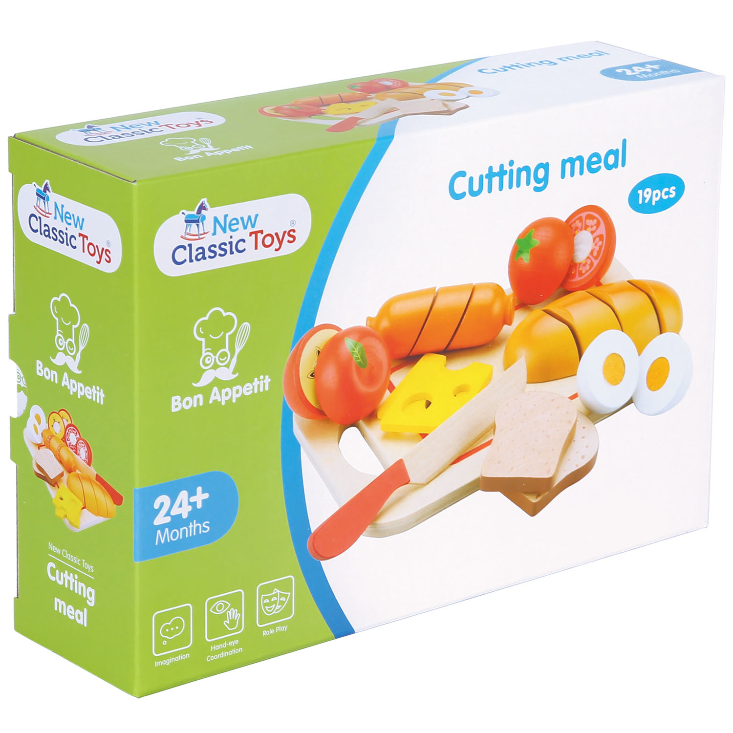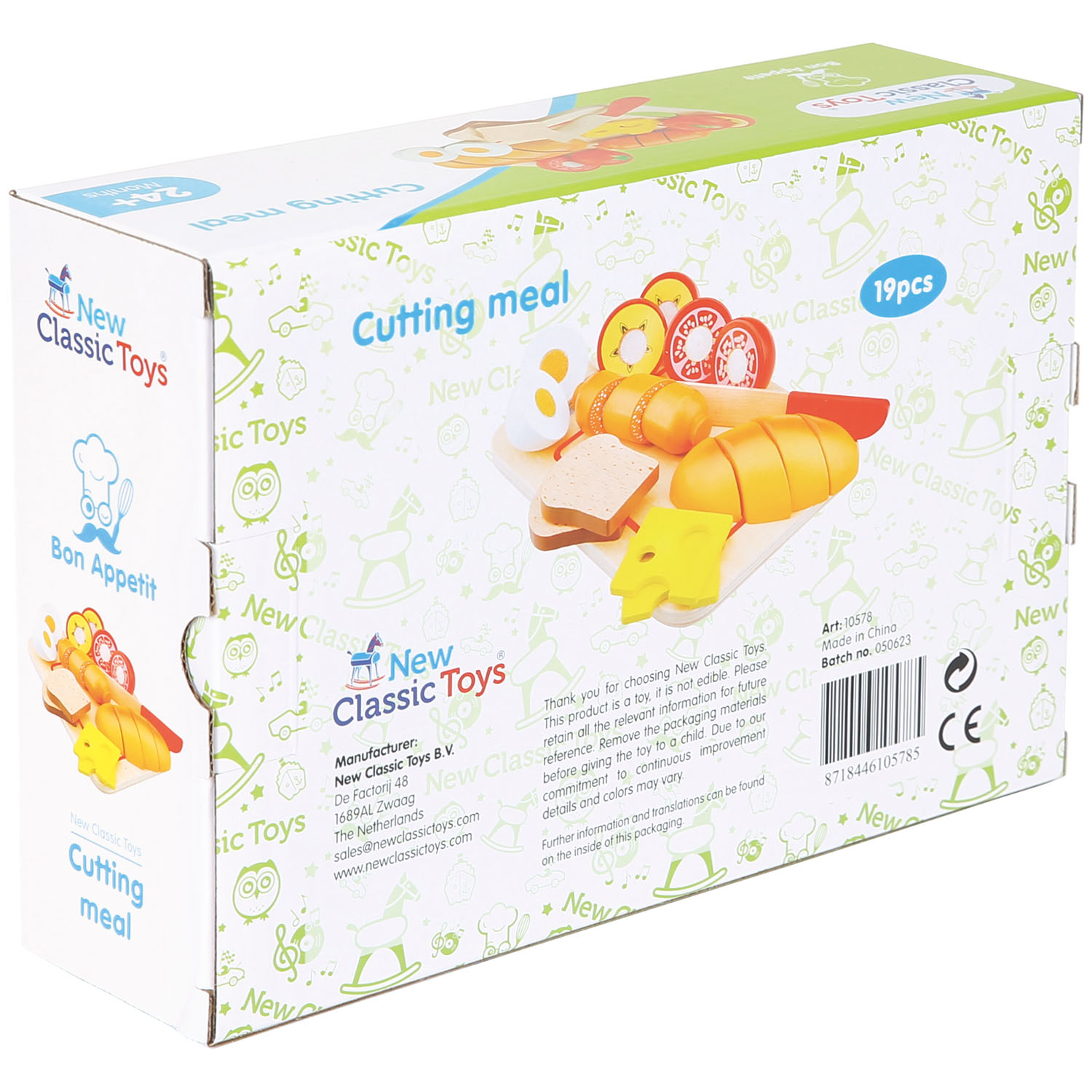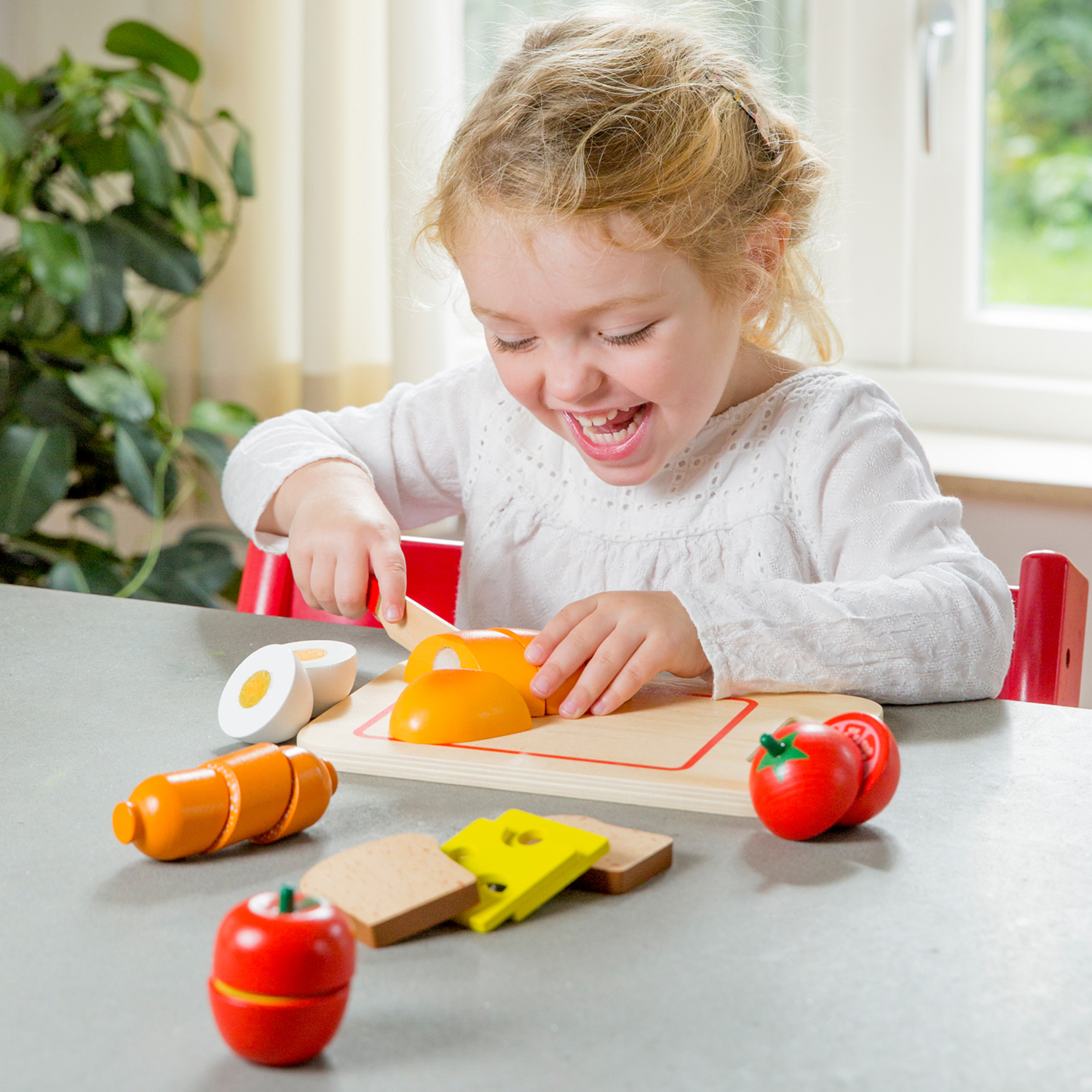 Deze ontbijt set van New Classic Toys is het perfecte speelgoed voor fantasierijk speelplezier. Deze set bevat een snijplank, een houten speelgoedmesje, twee sneetjes brood, een baguette, twee plakjes kaas, een eitje, een appel, een tomaat en een worstje. De meeste onderdelen zijn gemaakt uit meerdere delen die met klittenband aan elkaar zijn bevestigd, waardoor kinderen de etenswaren gemakkelijk kunnen ‘snijden’.
