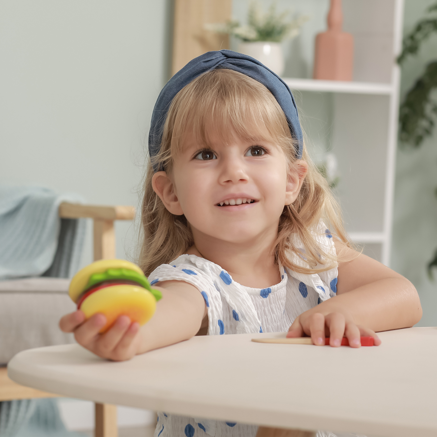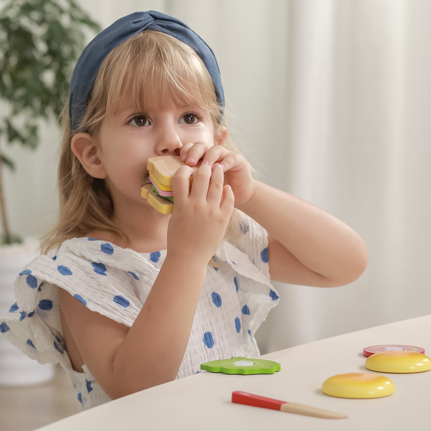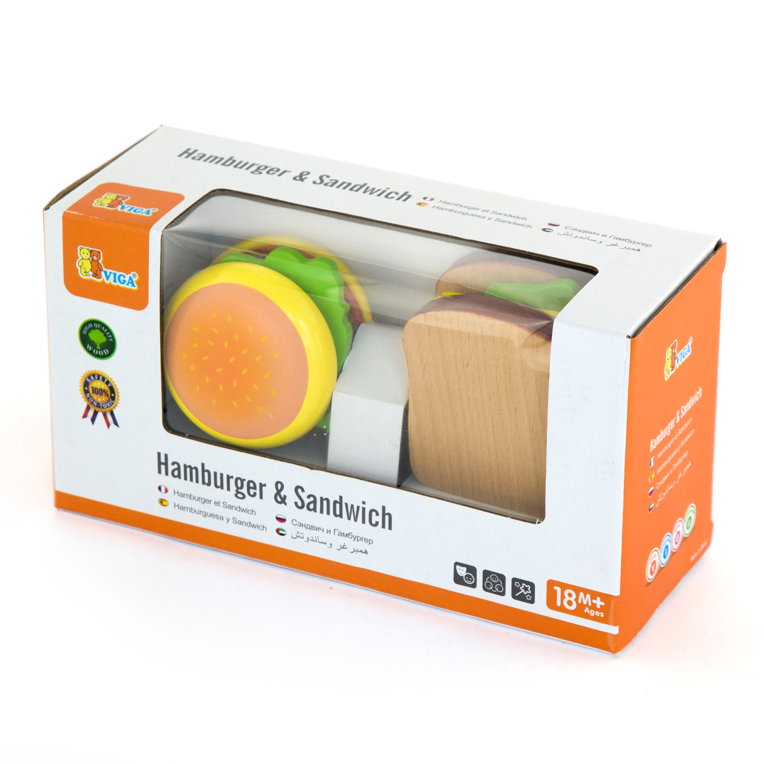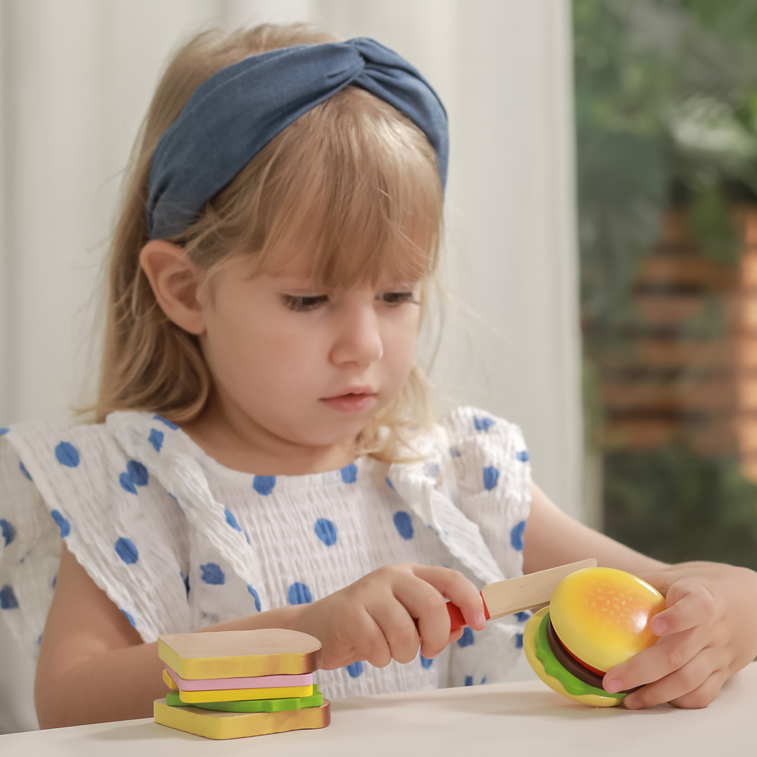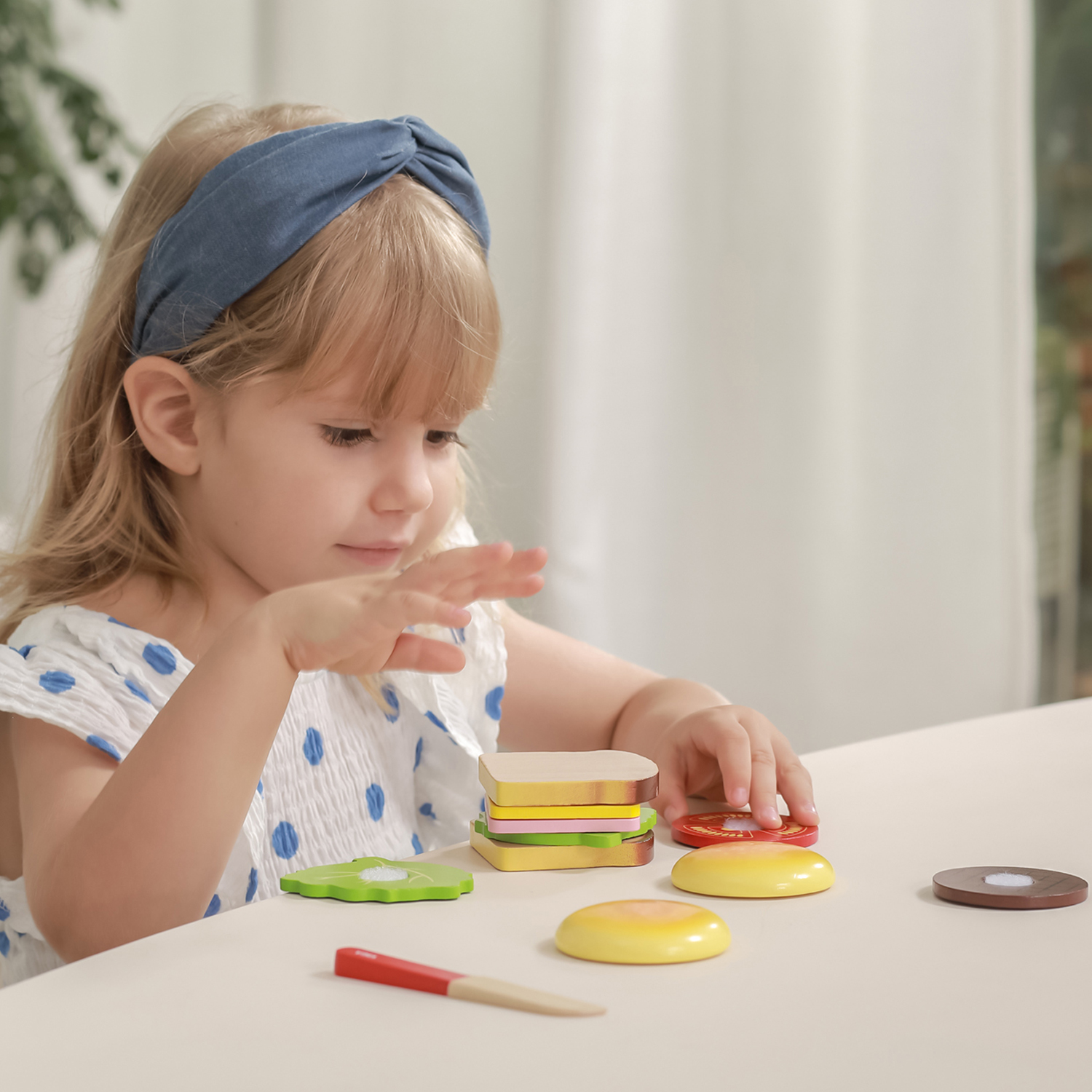 Voor in je eigen broodjeszaak deze mooie broodset. Maak zelf de heerlijkste hamburger of sandwich. Stimuleert de hand-oog coördinatie en de creativiteit. De hamburger en sandwich bestaan beide uit vijf delen die met klittenband aan elkaar kunnen worden verbonden.