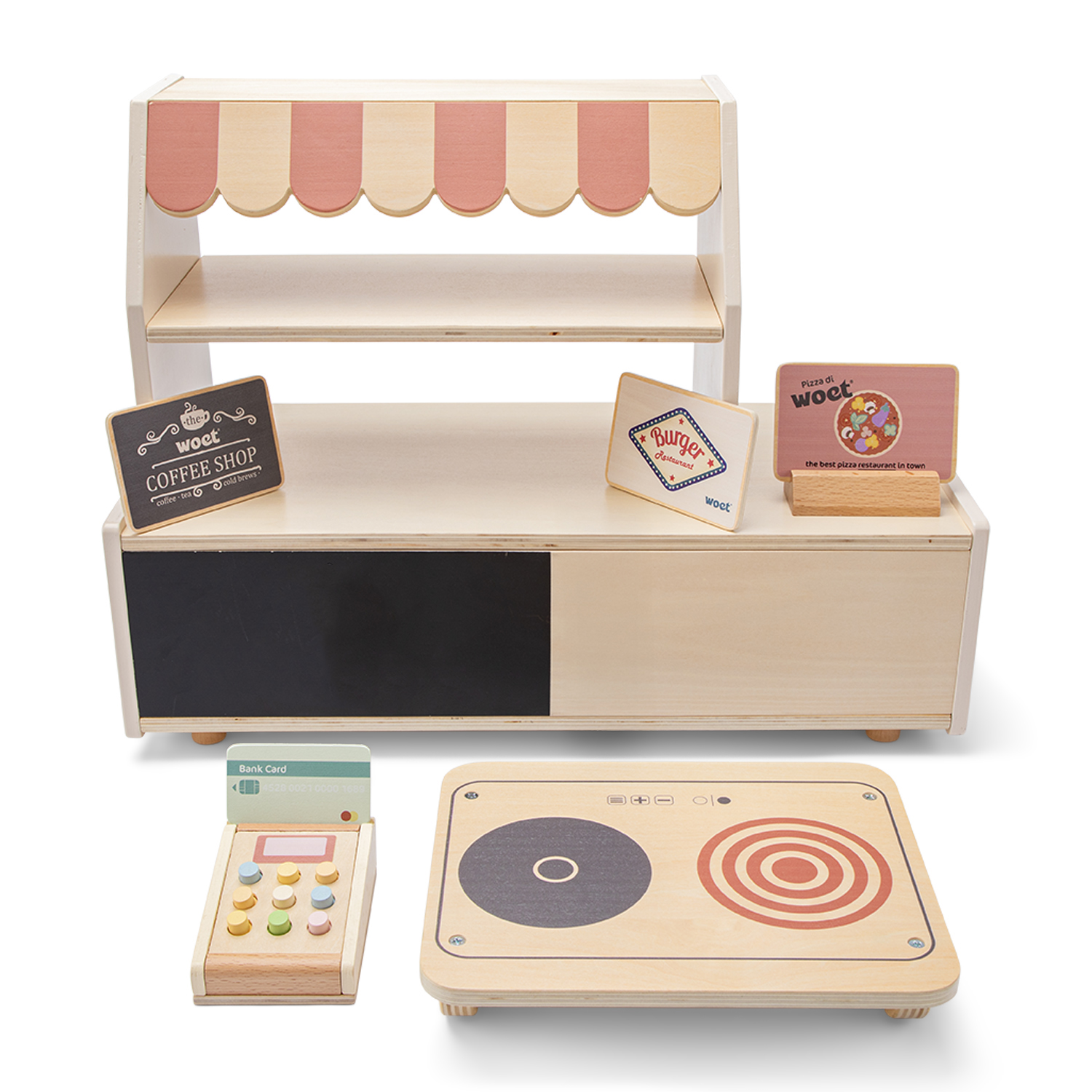 Met het Woet® houten winkeltje en restaurant speelgoed beleven kinderen eindeloos plezier in fantasierijk spel. Dit veelzijdige houten winkelstalletje kan telkens een nieuw avontuur worden: vandaag een burger restaurant, morgen een koffiewinkel of pizzeria. Dankzij de 3 dubbelzijdige themabordjes zijn er in totaal 6 speelmogelijkheden, waaronder ook een speciale “Closed”-zijde om je winkel of restaurant echt af te sluiten.