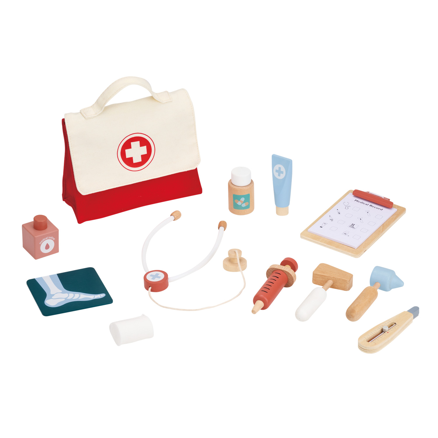 Deze mooie houten dokterset van Lelin® bevat alles wat kleine dokters nodig hebben om voor hun patiënten te zorgen. De hhouten speelgoed set bestaat uit een stevige stoffen dokters tas met realistische houten accessoires zoals een stethoscoop, spuit, thermometer, medicijnen, zalf, notitiebord, reflexhamer en verband.