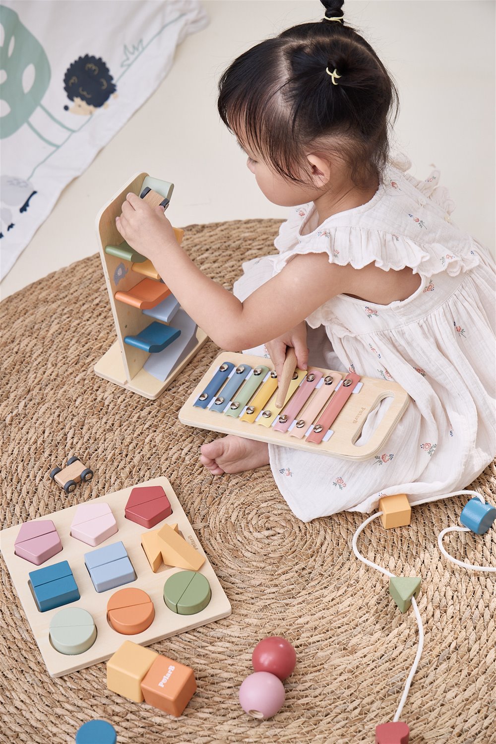 Kinderen kunnen muziek maken met de xylofoon, auto’s laten rijden op de autobaan, vormen sorteren, kralen rijgen en schroeven draaien met de moer- en boutset. Zo ontdekken ze oorzaak-gevolg, verbeteren ze hun fijne motoriek en leren ze spelenderwijs tellen, kleuren en vormen herkennen.