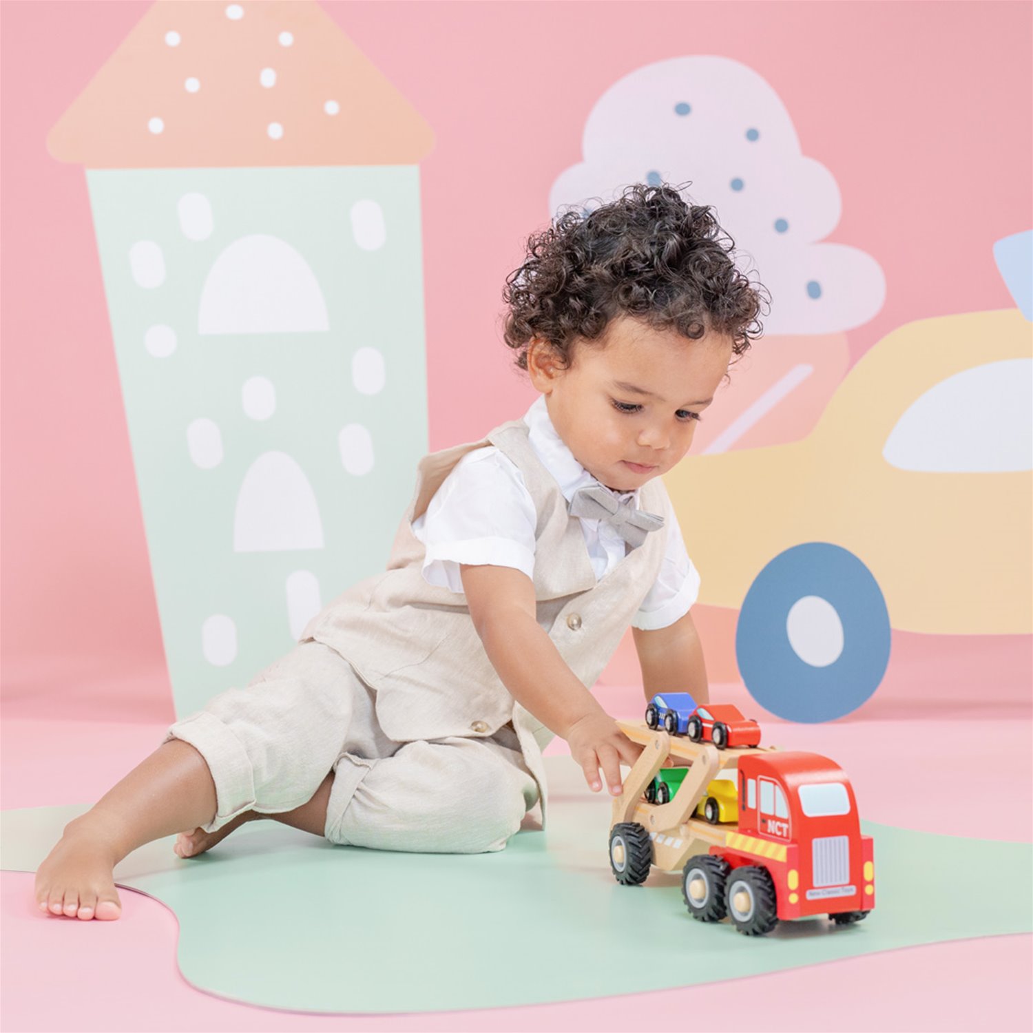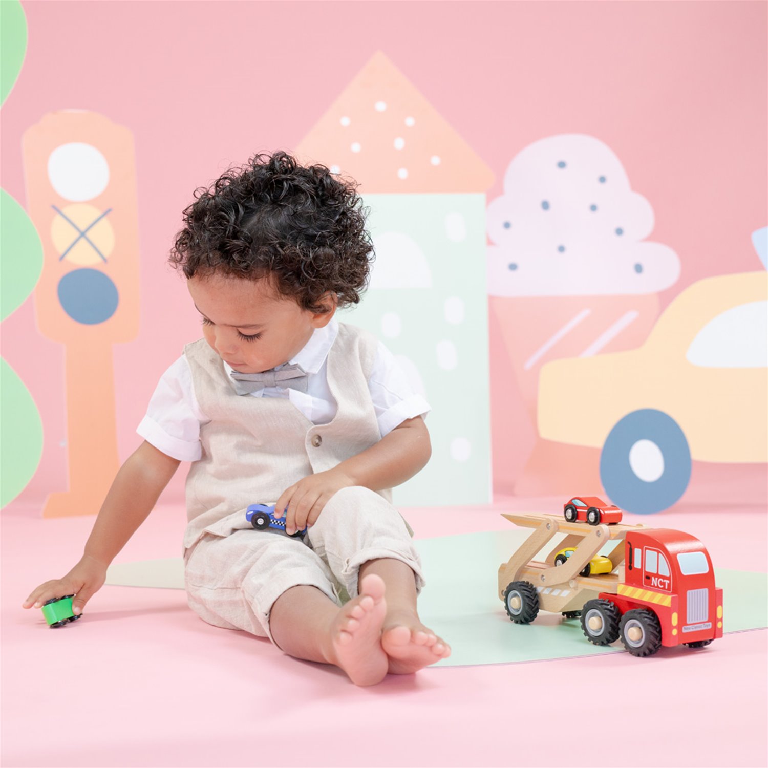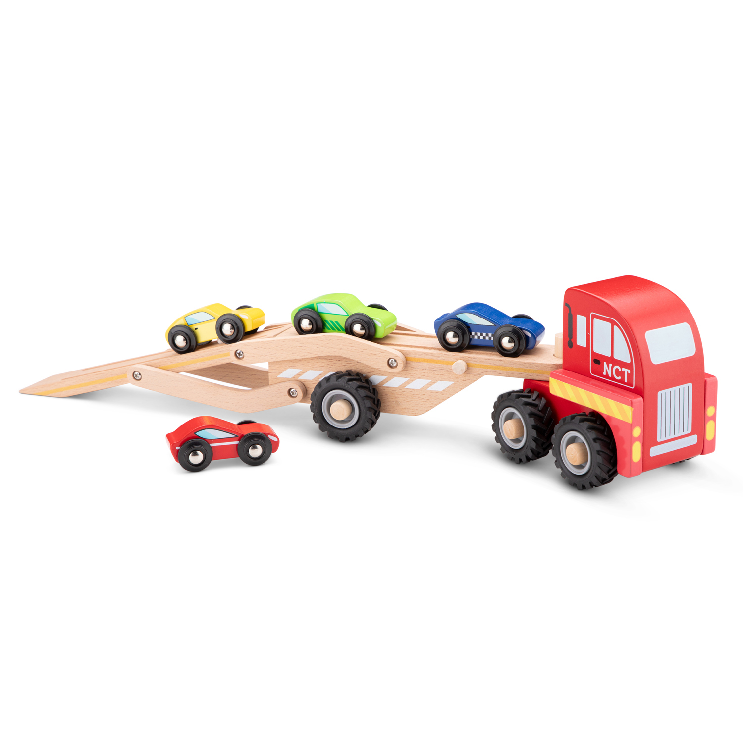 Deze houten autotransporter van Woet® is perfect voor kleine voertuigfans die graag rijden, laden en lossen. De stevige rode truck wordt geleverd met een beweegbare laadklep en vier kleurrijke autootjes die kinderen eenvoudig kunnen op en neer rijden. Eerst alle auto’s opladen en dan op weg naar de volgende bestemming.