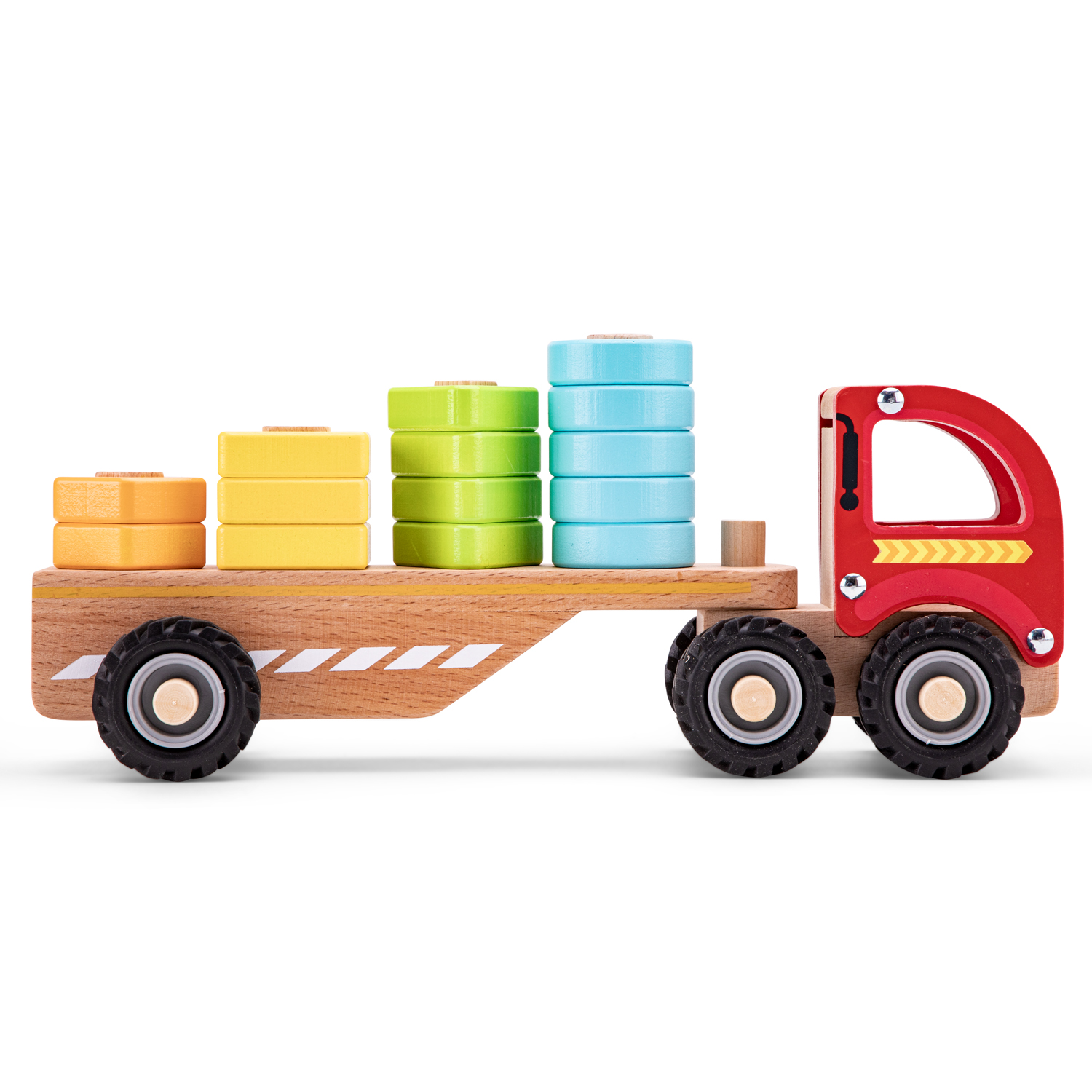 Spelen met deze houten vrachtwagen stimuleert kleurherkenning, vormherkenning en ruimtelijk inzicht. Het op de pinnetjes schuiven van de geometrische vormen helpt kinderen bovendien om hun fijne motoriek te ontwikkelen. Doordat de aanhanger losgekoppeld kan worden, kunnen kinderen nog meer variëren in hun spel.